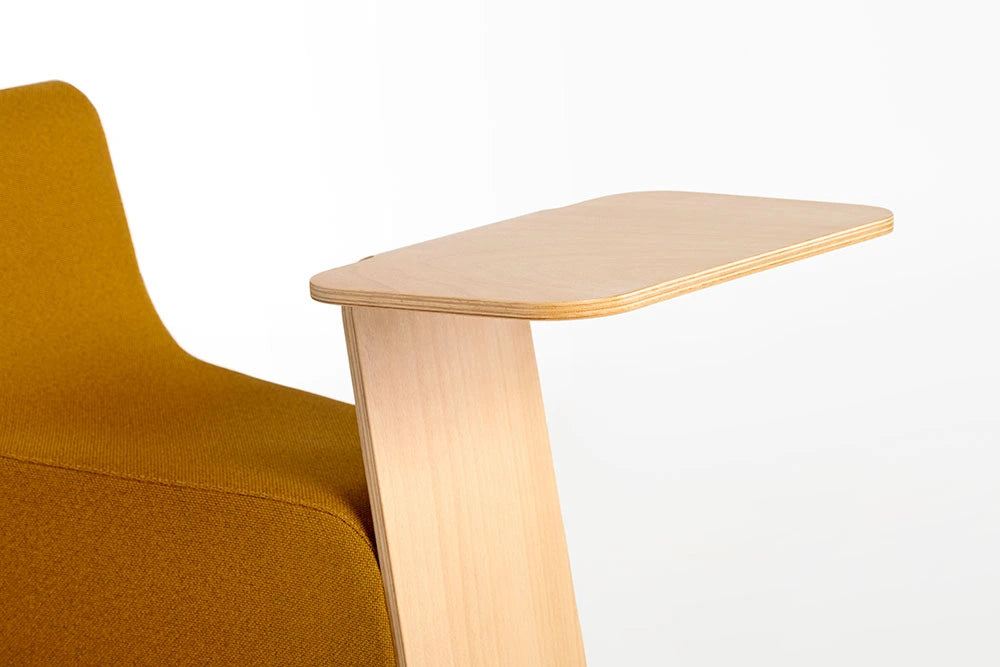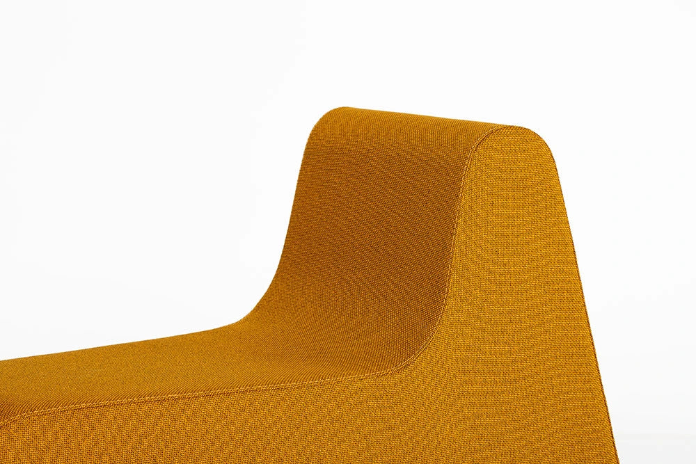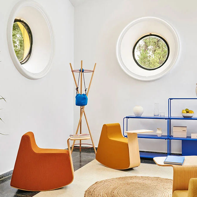 The Platero line combines an ottoman and side table in a single piece, evoking the imagery of the South with forms inspired by the equestrian world. Wooden structure, colorful fabrics, and enveloping comfort designed by Dsignio for waiting areas, hotels, and informal spaces. Keywords: ottoman with table, lounge seating, wood, Mediterranean design.