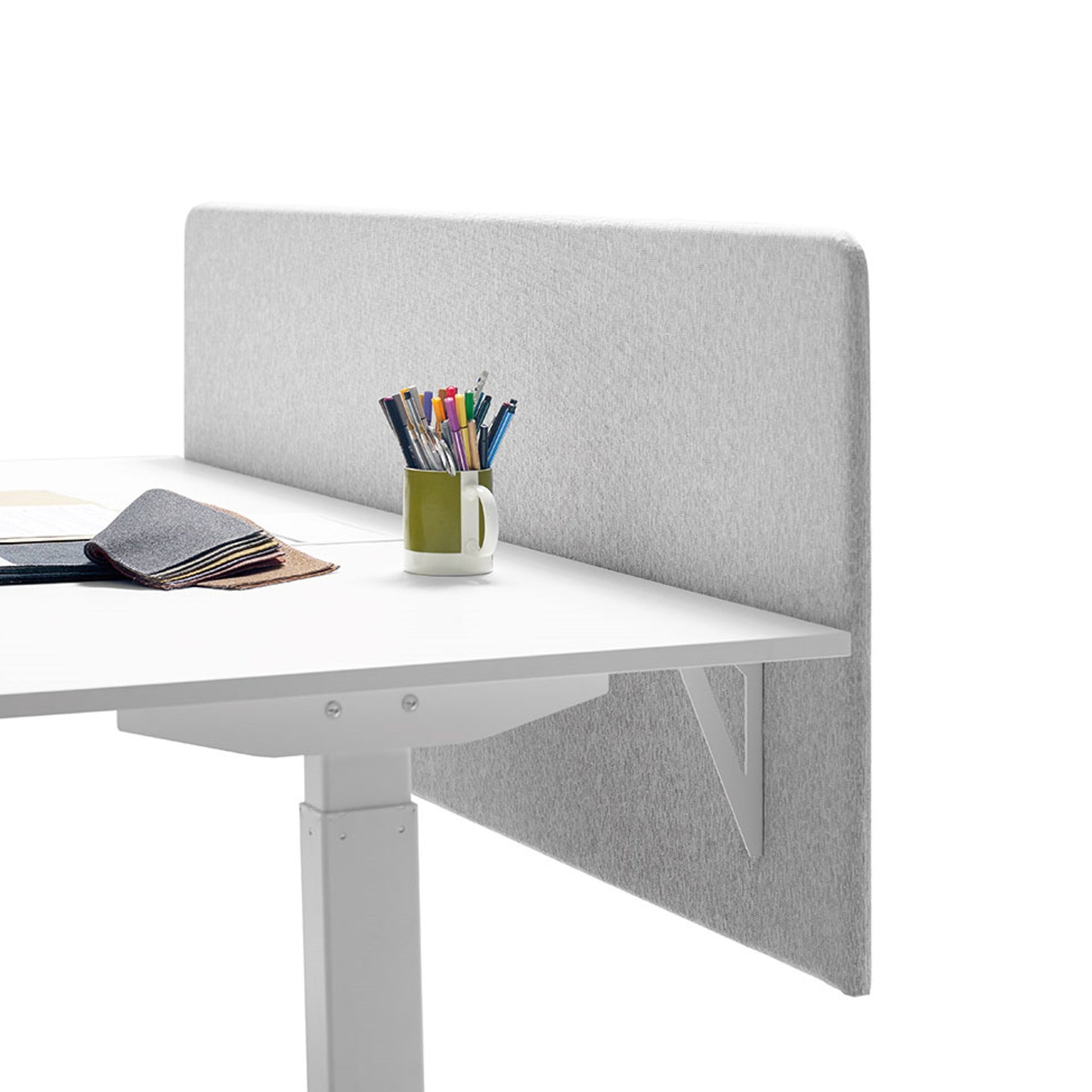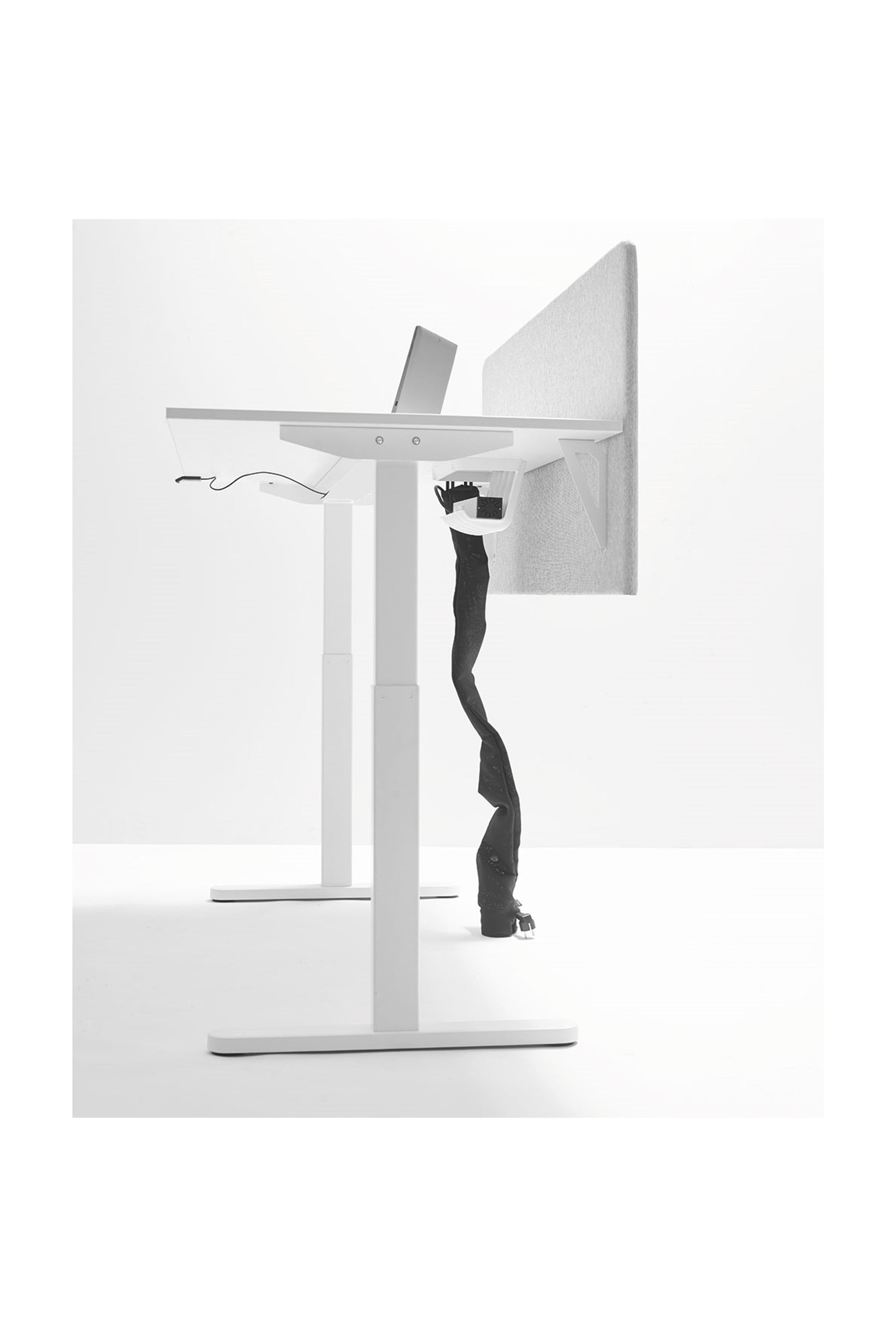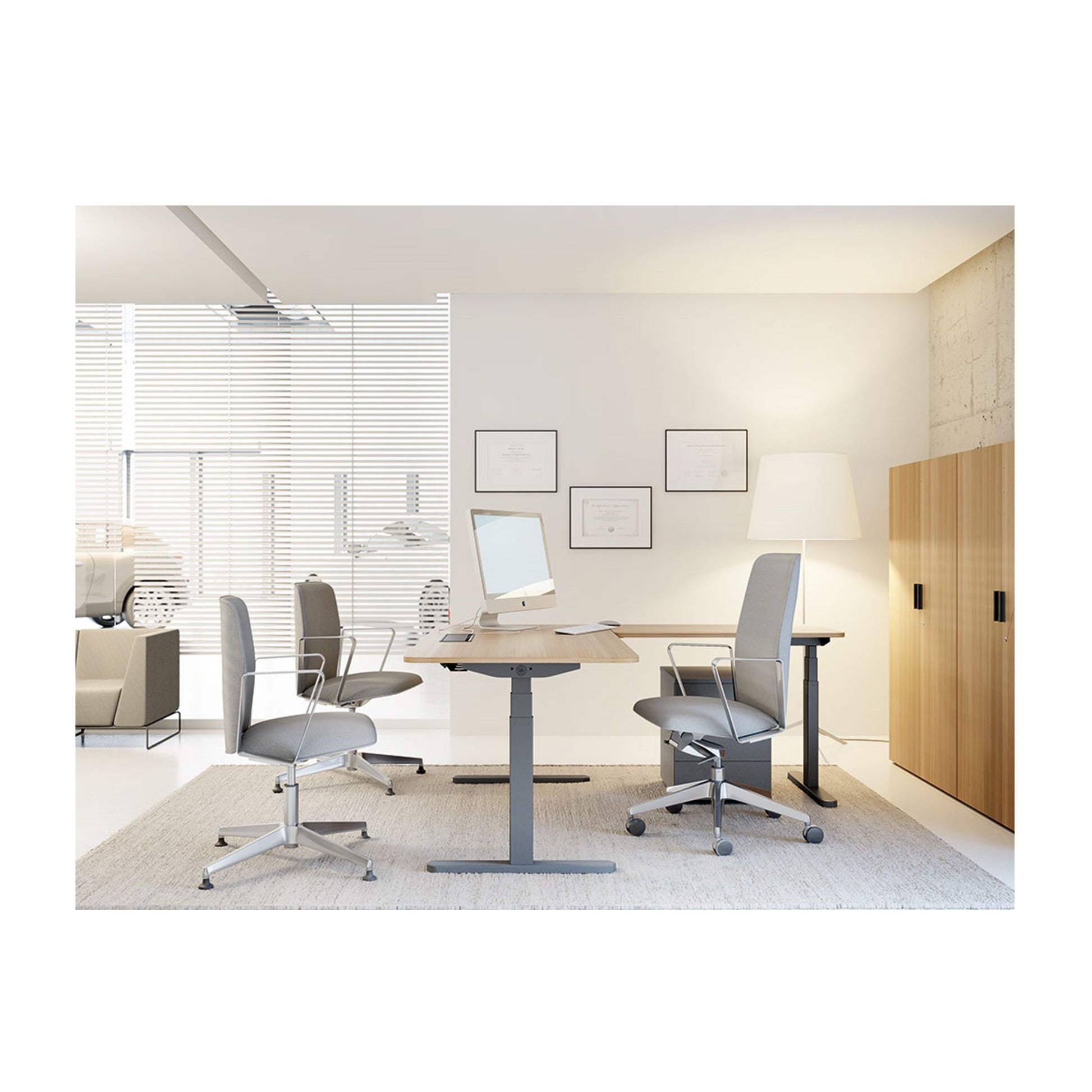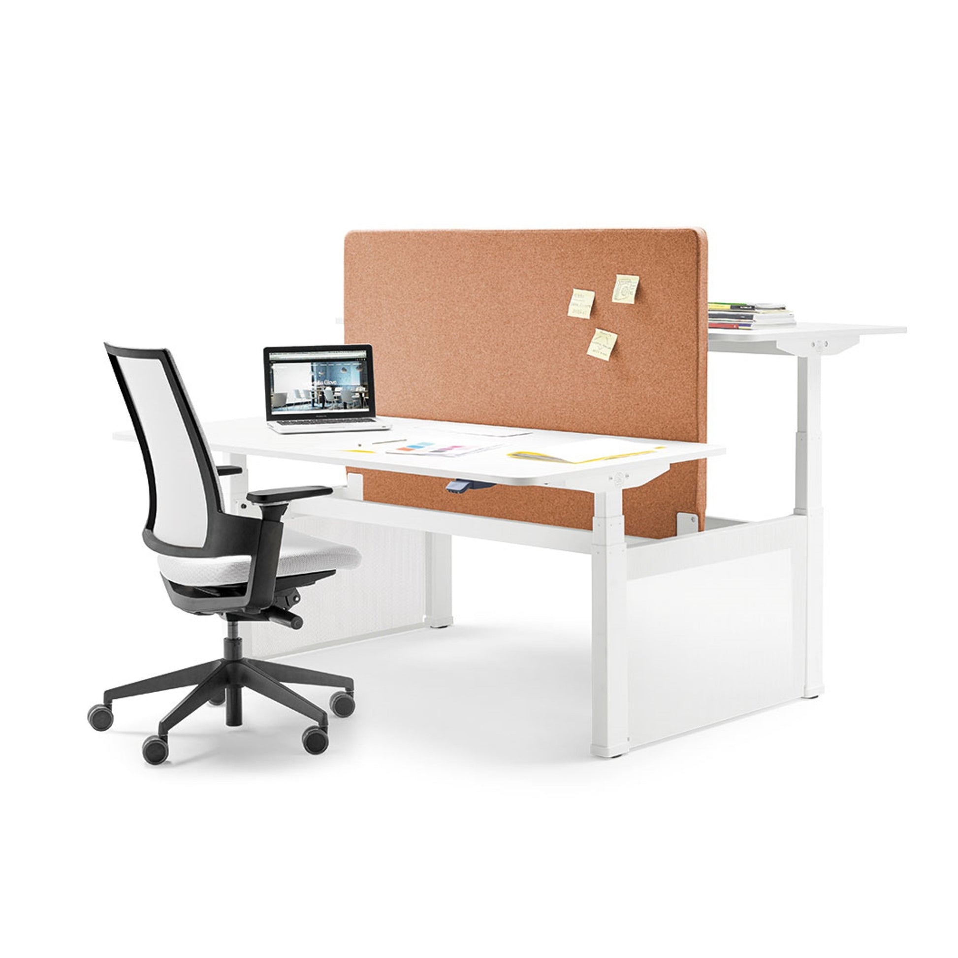 Height-adjustable desk system with electric lift. Ergonomics and productivity for individual and shared workstations, and small, spontaneous meetings.