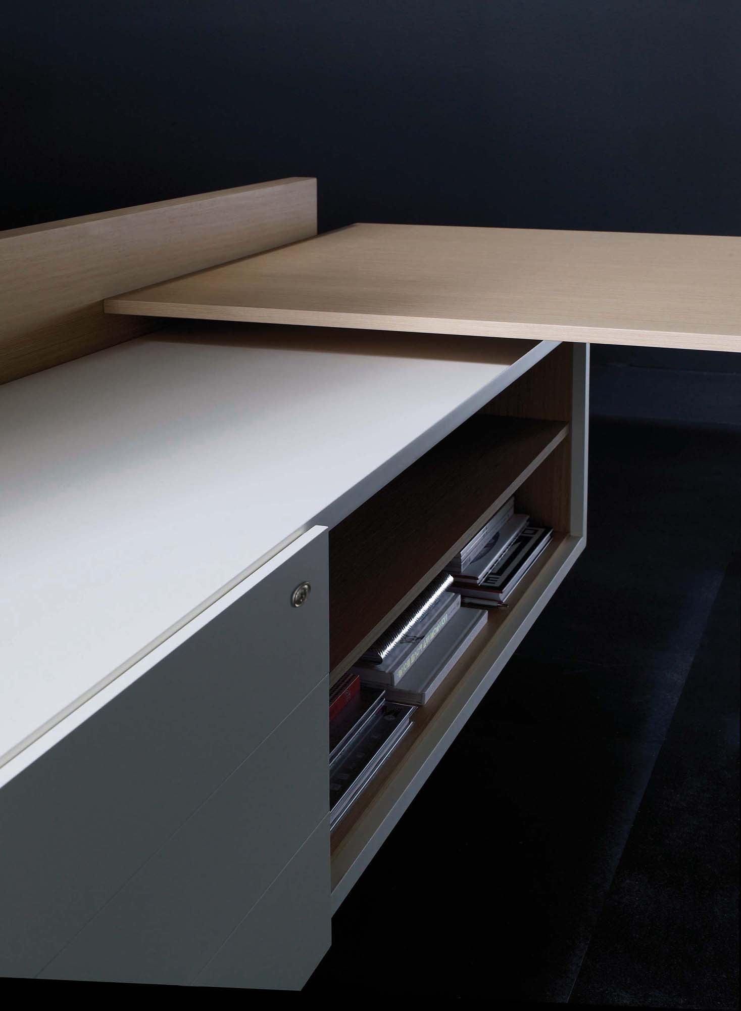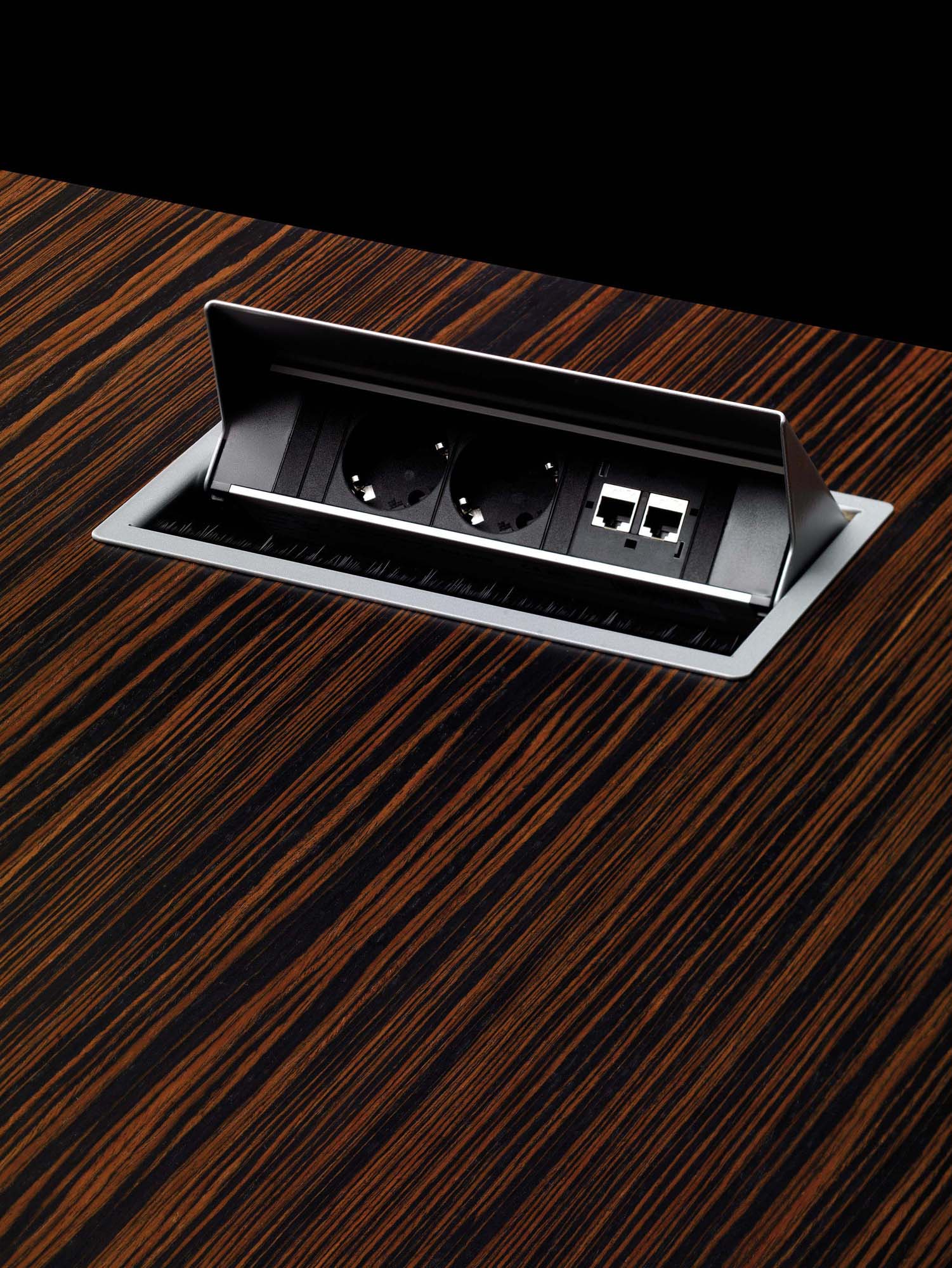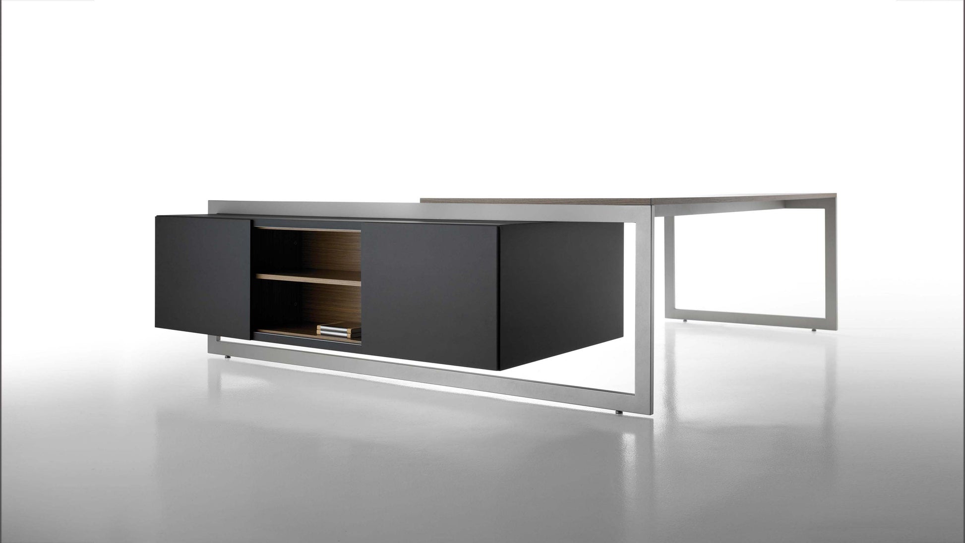 Program of operating and executive desks with precise metal structure and technical design. Allows linear and corner configurations, with cable management and storage options.